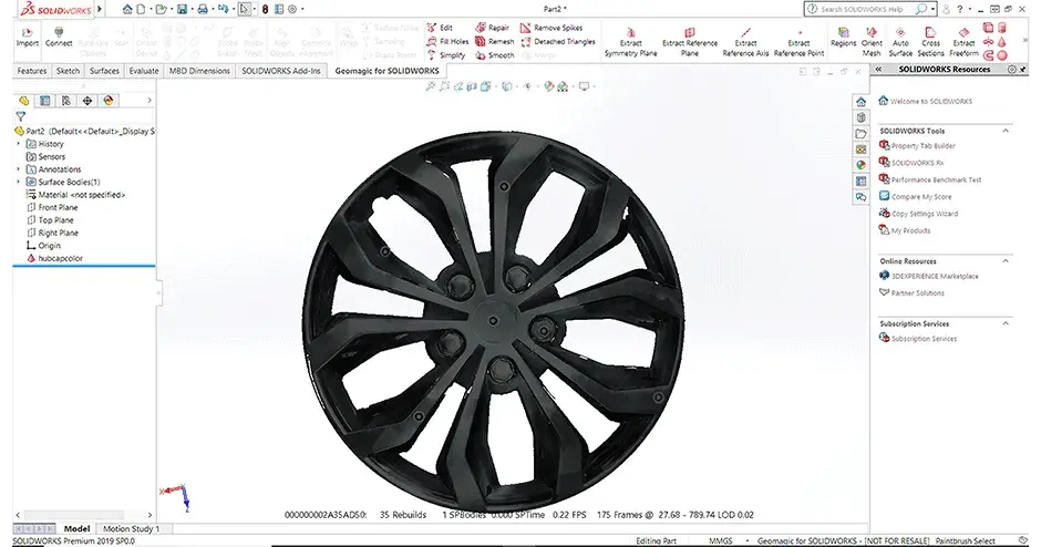 Geomagic for SOLIDWORKS is the industry’s only complete integrated 3D scan-to-SOLIDWORKS software solution. The software helps designers reduce the time required to build CAD models of real-world objects from hours to minutes by using advanced, automated wizards to quickly and easily create sketches, surfaces, and feature-based editable solid parts inside SOLIDWORKS – directly from 3D Scan data.
